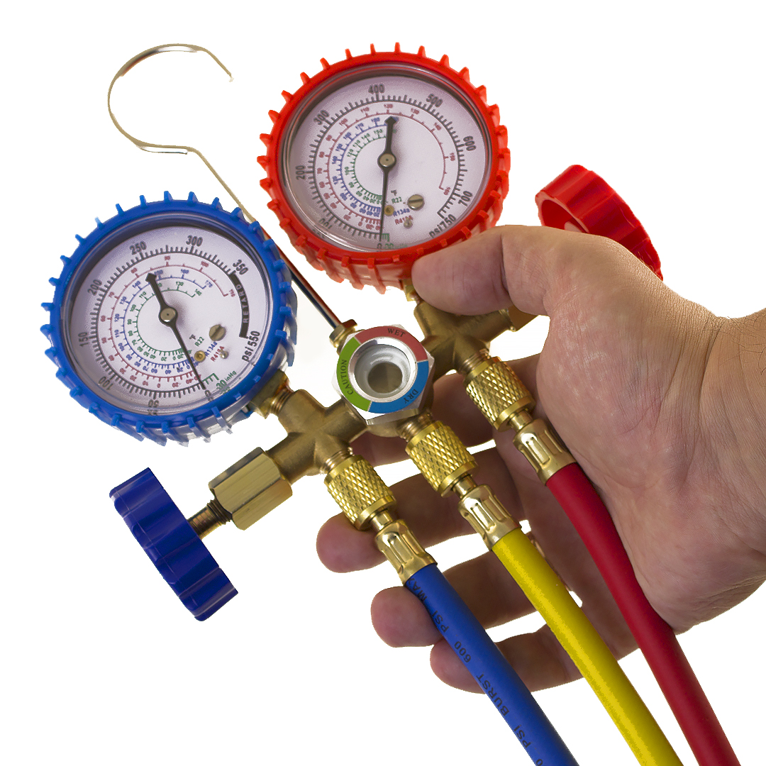 Манометрическая станция (коллектор), имеющая два манометра, 2 вентиля, три штуцера и смотровое окно. Позволяет одновременно измерять давление в обоих контурах, проводить вакуумирование, заправку и дозаправку хладагентом. На шкалах нанесены температуры кипения хладагентов R22, R404a, R410a.